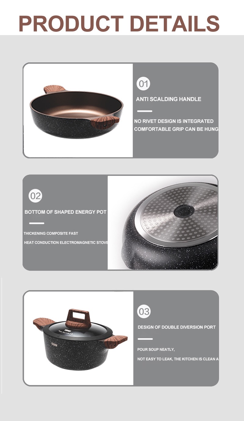 Bottom spout and coatings: overlay bottom + one layer of Jihua sprinkle outside, 2 layers of Penfolds water-based non-stick sprinkles inside Lid + fittings: silicone Glass lid,lid bead + side ear + handle spray wood grain, do wood grain soft silicone Weight and thickness: 20 saucepan 790g 24 saucepan 1080g 28 saucepan 1185g 28 shallow saucepan 1070g Wall thickness / bottom thickness 20/24/28/28 shallow saucepan 1.7/4.5mm LOGO: bottom mark steel printing LOGO, pot body laser LOGO, glass cover silkscreen LOGO and advertising slogan Selling Points: can be used for induction cookers, electric stoves, gas stoves, light wave ovens, ceramic stoves, halogen stoves to use , overlaying the bottom of the