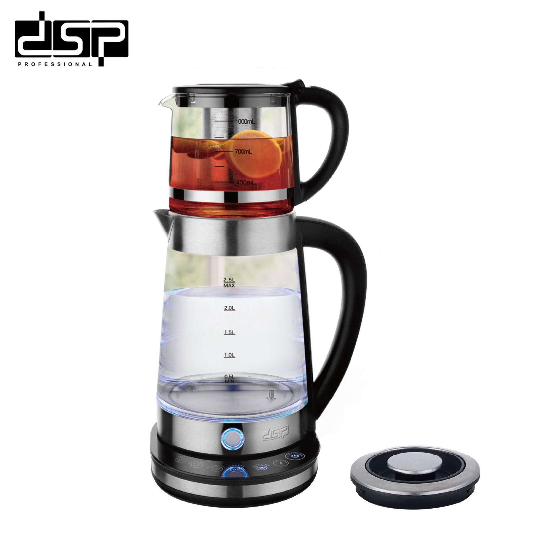 Capacity:Kettle actual capacity 2.2L,max 2.3L(false label 2.5L) + Tea kettle 1.0L(Borosilicate glass 304 strainer)