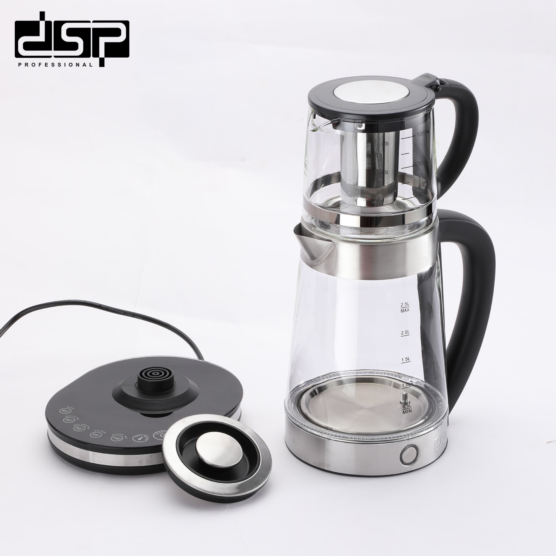 Capacity:Kettle actual capacity 2.2L,max 2.3L(false label 2.5L) + Tea kettle 1.0L(Borosilicate glass 304 strainer)